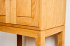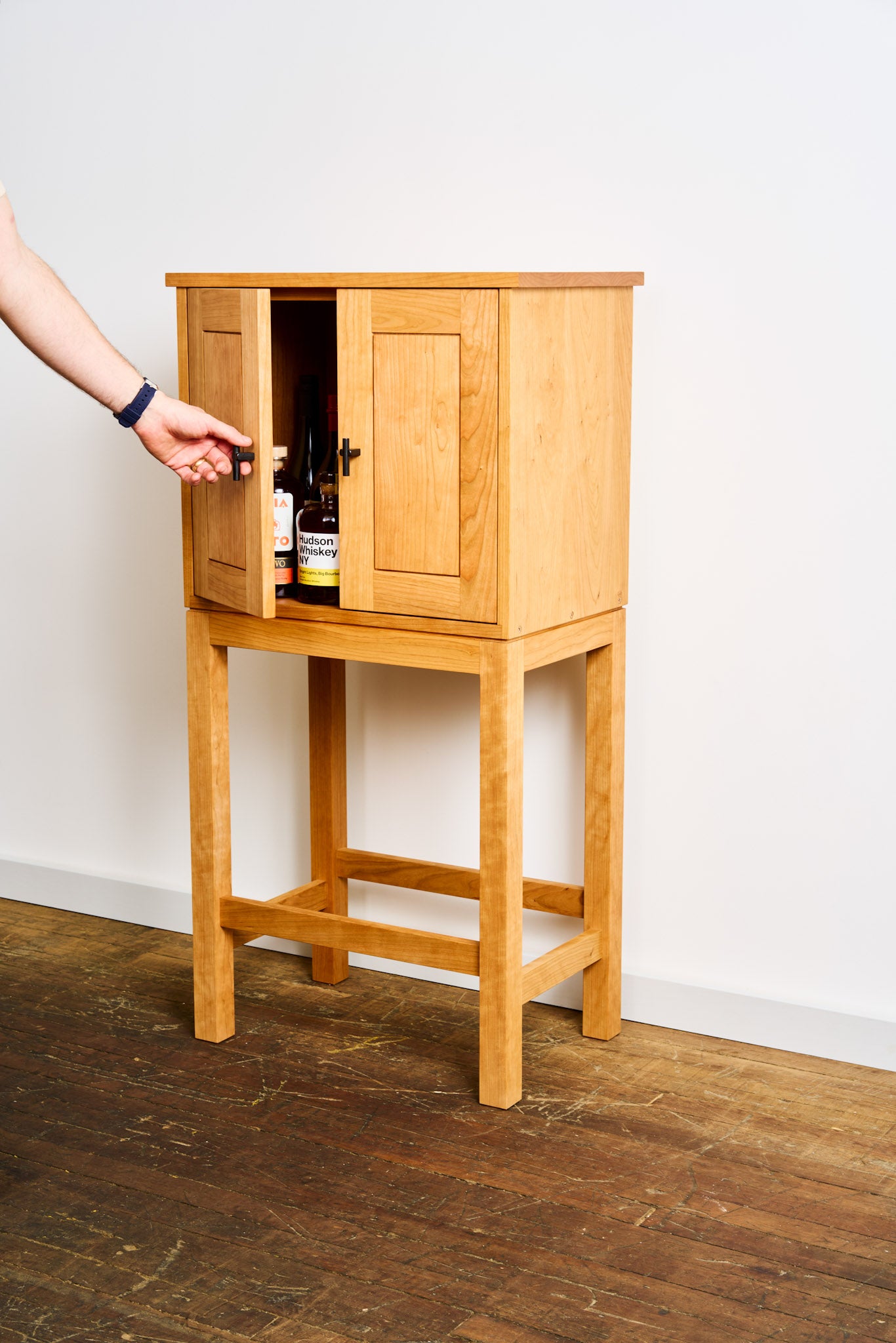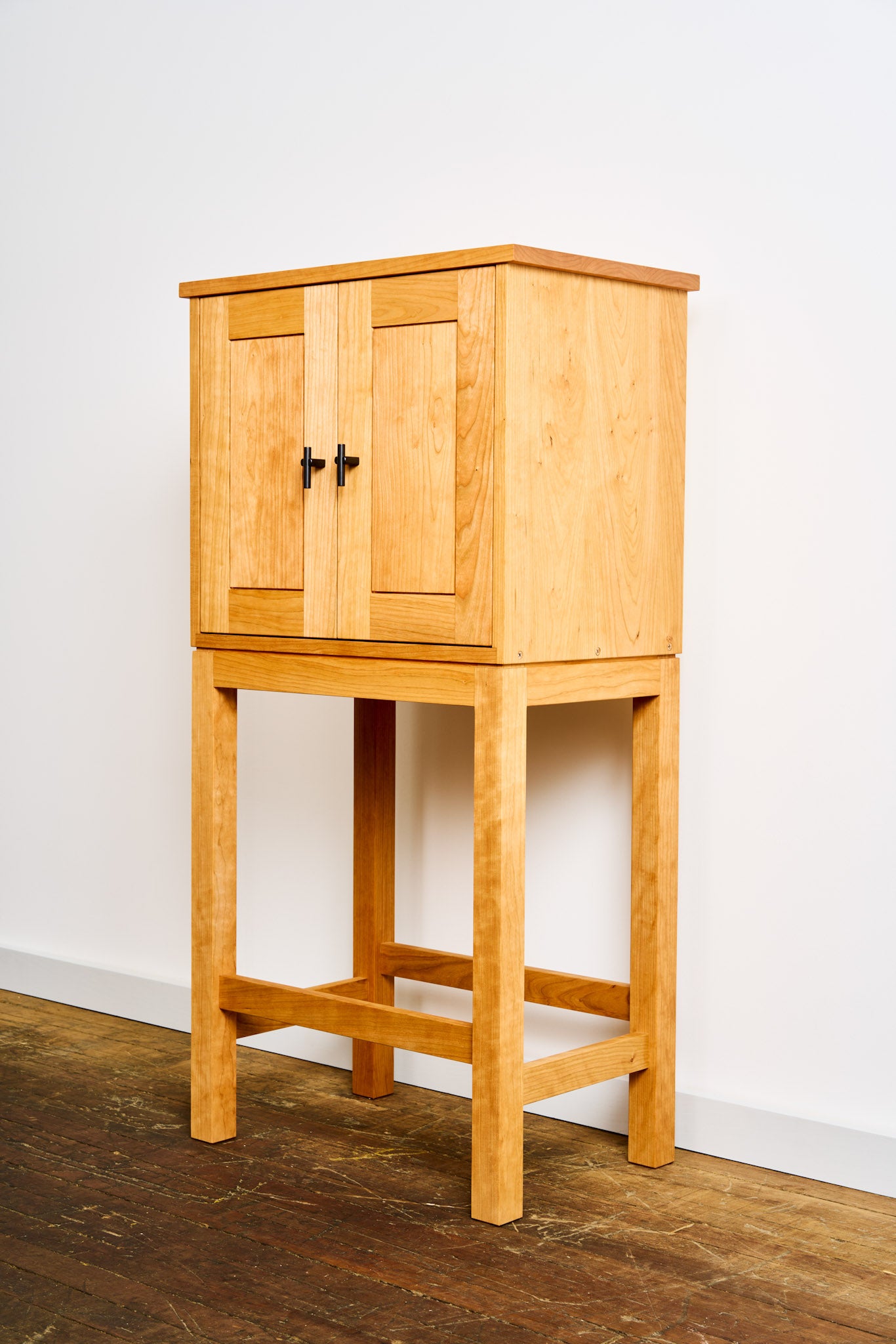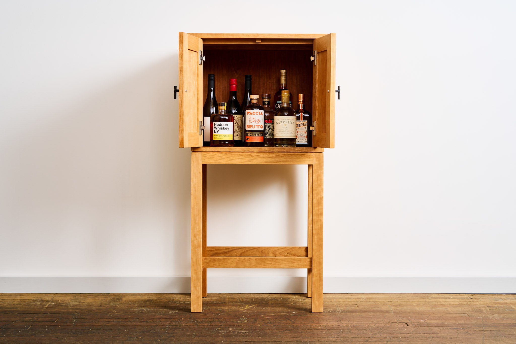 Crafted from smooth North American cherry, it features a sturdy, compact frame that fits seamlessly into dining rooms, living spaces, or tucked beside a bar cart. Handmade steel handles add a subtle, industrial detail, while the interior provides practical storage for bottles, glassware, and entertaining essentials.